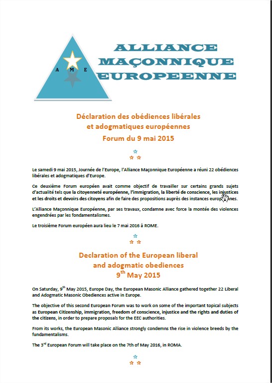 A Grande Loja Simbólica de Portugal e o Grande Oriente Lusitano, estiveram presentes no Fórum da Alliance Maçonnique Europeenne, ao qual se produziu uma Declaração que servirá de plataforma a projectos concretos no âmbito da União Europeia.